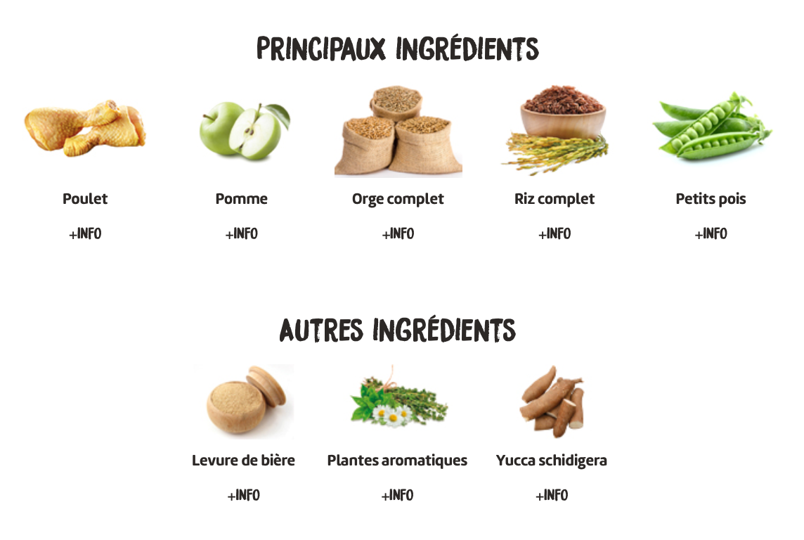 Viande 36% (viande déshydratée 26%, poulet frais* 10% avant l'extrusion), orge complet* (10%), petits pois entiers* (9%), maïs complet* (9%), graisse de poulet, protéines de maïs, blé complet* (7%), hydrolysat de saumon (5%), riz complet* (2%), levure de bière* (2%), protéines de poulet hydrolysées, pomme* (1%), huile de saumon, pulpe de betterave, fructo-oligosaccharides et mannane-oligosaccharides, plantes aromatiques 0,02% (fenouil*, fleur de camomille*, anis vert*), yucca schidigera. *INGRÉDIENTS NATURELS