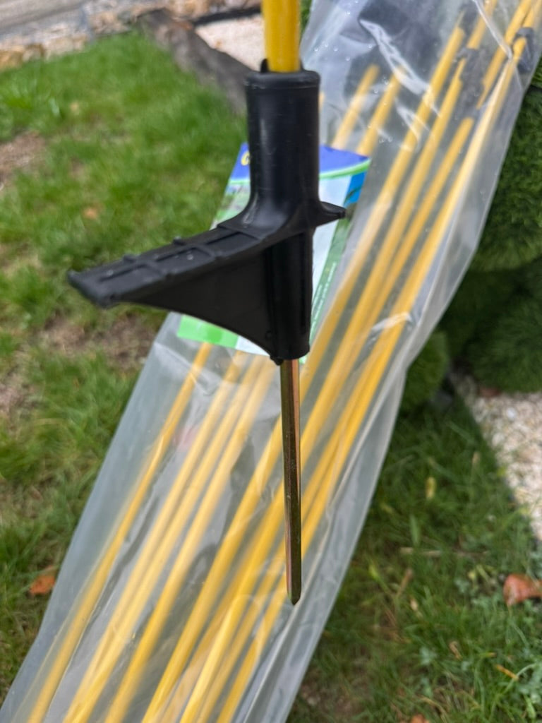 Lot de 10 piquets fibre 110 cm avec 2 isolateurs et surtout des pointes en metal plus résistant pour enfoncer dans le sol.