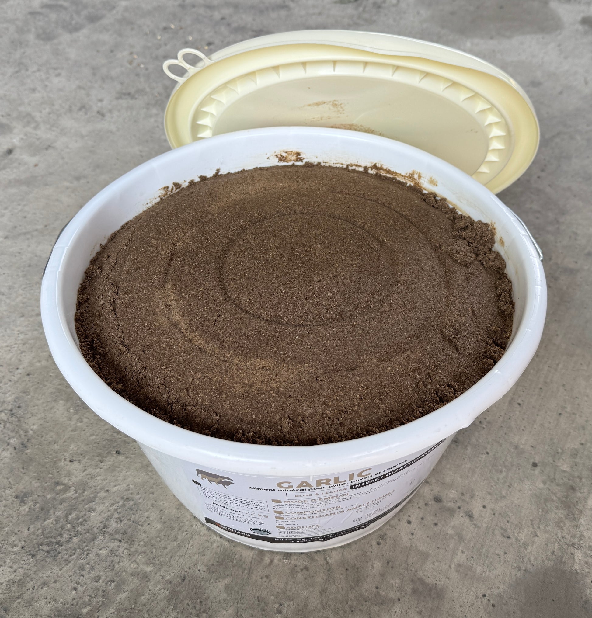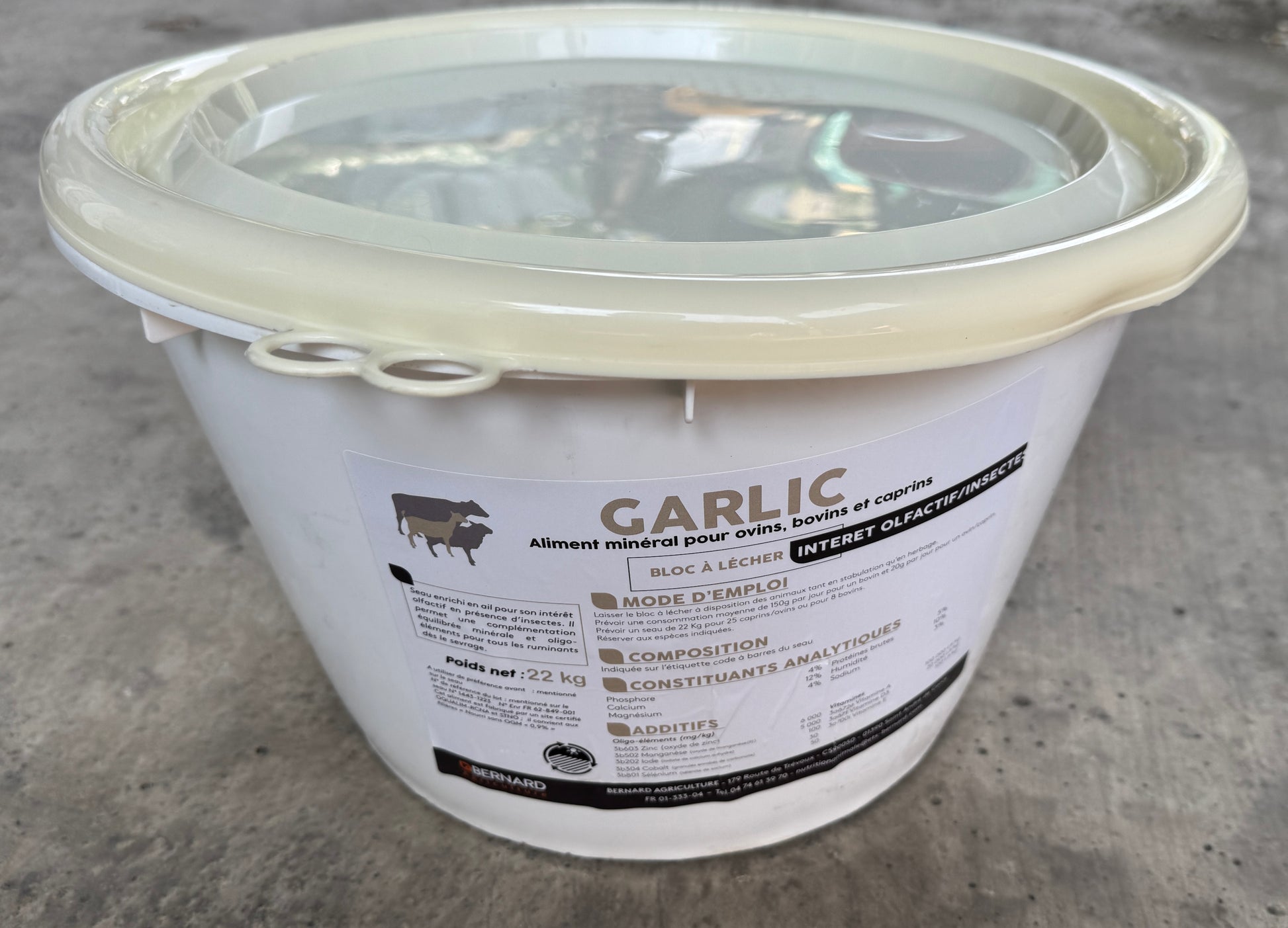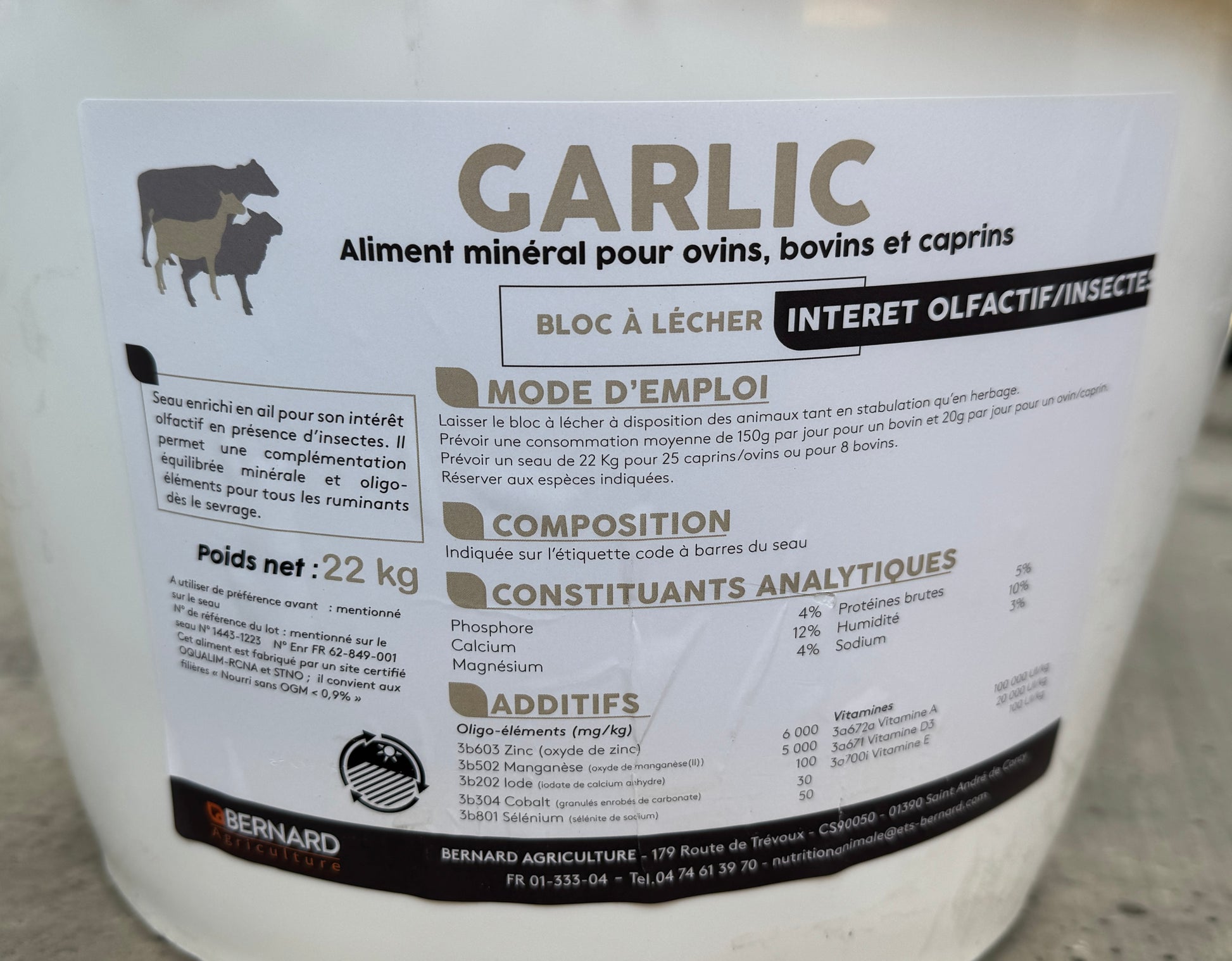 Seau enrichi en ail pour sont intérêt olfactif en présence d'insectes .il permet une complémentation équilibrée en minéraux et oligo-éléments pour tous ruminants des le sevrage .