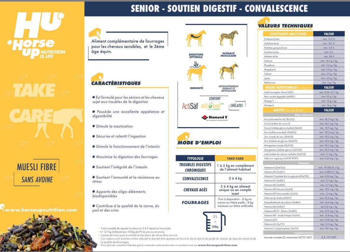 TAKE CARE est adapté aux chevaux sujets aux coliques, diarrhées, ulcères, convalescents et aux vieux chevaux.