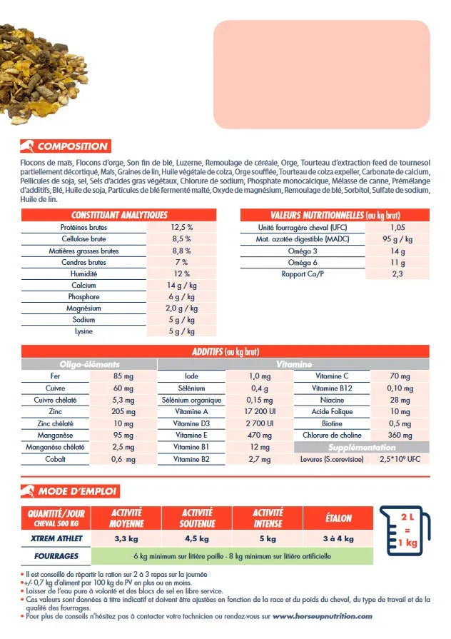 Muesli complémentaire de fourrages pour chevaux pratiquant la compétition à un niveau amateur et pro, ainsi que pour les étalons en période de monte.
